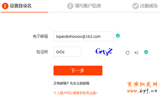 3、來到郵箱注冊頁面,填寫電子郵箱——輸入驗證碼——點擊下一步