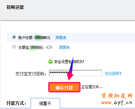 6、花唄還款的方式跟日常付款是一樣的,但是是不支持用花唄來還花唄的錢的,至于還款方式支持支付寶、銀行卡、余額寶等方式。這里使用支付寶付款,輸入支付寶密碼,點擊“確認付款”。