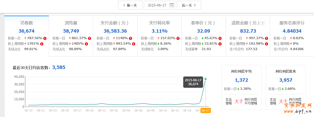 本店報名的寶貝排期是在2015.6.17下午17:00,16日收到的二審?fù)ㄟ^的信息,因此準(zhǔn)備的時間比較倉促,在經(jīng)過包括庫存、裝修、海報、詳情之后,就等17號開始大賣了。截止活動開始之前寶貝的關(guān)注度已經(jīng)達(dá)到了1.8萬,在該時間段的處在比較靠前的位置,說明寶貝還是比較受歡迎的。