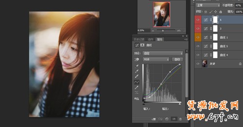 4、這一步,我們通過曲線降低高光區的,暗部則繼續加強,具體而言,紅綠曲線提高,藍調曲線降低,這樣字,色彩會更加的豐富。
