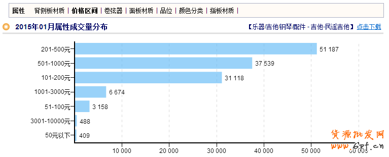 從生意經中,吉他這個類目屬性成交量分布,可以看到背側板的材質為椴木的成交分布量是最高的,面板的材質為云衫木的成交分布量是最高的,其次是椴木,而指板的材質為玫瑰木的成交分布量是最高的,所以在吉他制作材質選擇的時候,背側板、面板、指板的材質以成交量最高的來進行選擇。