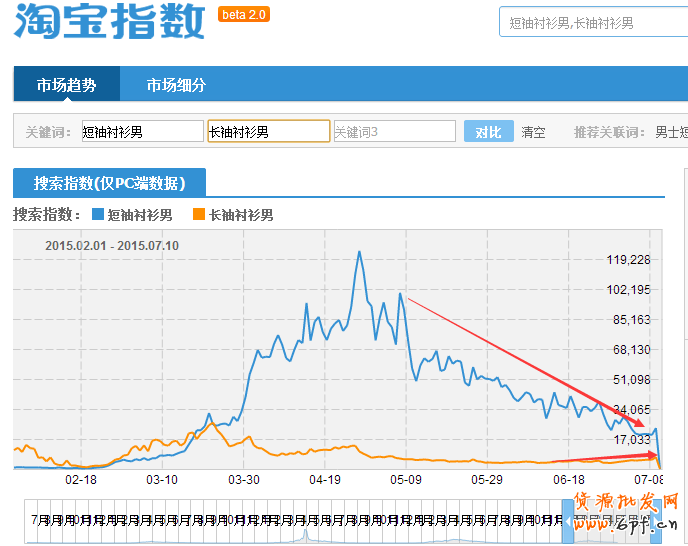 從以上淘寶指數(shù)搜索“短袖襯衫男”和“長(zhǎng)袖襯衫男”可以發(fā)現(xiàn),“短袖襯衫男”在五月份搜索指數(shù)達(dá)到上半年的最高峰,而到了六月份以后,行業(yè)搜索指數(shù)大幅度下滑,到了七月上旬搜索指數(shù)已經(jīng)很低了,而這時(shí)候如果店鋪內(nèi)都是夏款,顯而易見,店鋪的流量整體會(huì)大幅度下滑,而“長(zhǎng)袖襯衫男”到七月份以后搜索指數(shù)逐漸提升。