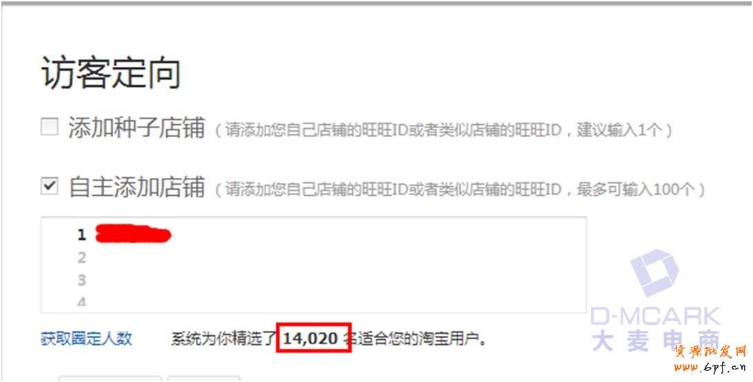 在定向方面,可以根據(jù)店鋪訪客情況或投放目的來設(shè)置,如拉新或是召回老客戶。拉新主要以定向競爭對手店鋪或興趣點為主,而召老比較常見的就是定向自己店鋪。根據(jù)這個店鋪老客戶回訪占比低的情況,筆者這次投放目的主要是召老,則定向自己店鋪: