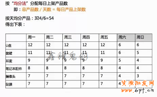 按照前邊提到的平均分布的方法,去確定每天商家多少商品,每小時商家多少商品。這樣的說法是針對店鋪寶貝數量多,上新頻繁的商家,可以參考這樣操作。