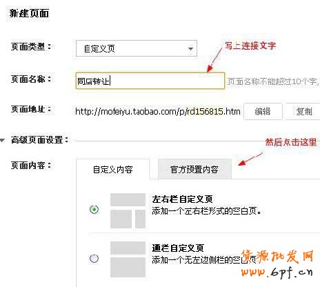 5.在新建頁面中填寫內容,首先在頁面名稱中寫上“同店轉讓”,當然不一定要寫這個,寫其他也可以,填寫好頁面名稱之后,點擊“官方預置內容”,把“同店寶貝轉讓”勾選了。(如下圖)