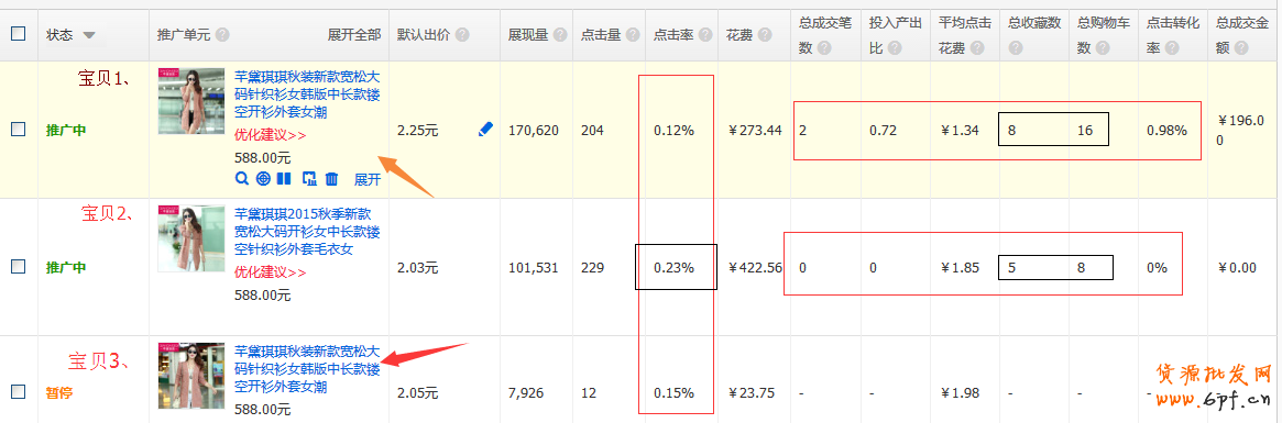 在圖一反饋的信息中,我們可以看出,3款寶貝一周的數據反饋效果,這3個寶貝中點擊率最好的是寶貝2。這款寶貝雖然點擊率高,但是沒有成交量。反觀寶貝1雖然點擊率是最少的,但是卻有成交,而且加購和收藏都比之其他2款寶貝的效果要好。而最下方的寶貝雖然點擊率相比之下還不錯,但是基本沒收藏也沒加購。這時候我們就大致可以確定寶貝3是咱們后期要淘汰的寶貝,而寶貝1則是后期要提升點擊率的寶貝。