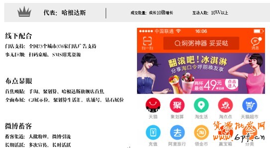 哈根達(dá)斯:通過(guò)線下店鋪、微博、首焦三位一體,實(shí)現(xiàn)成交瘋長(zhǎng)10倍以上,互動(dòng)人數(shù)達(dá)10W+。