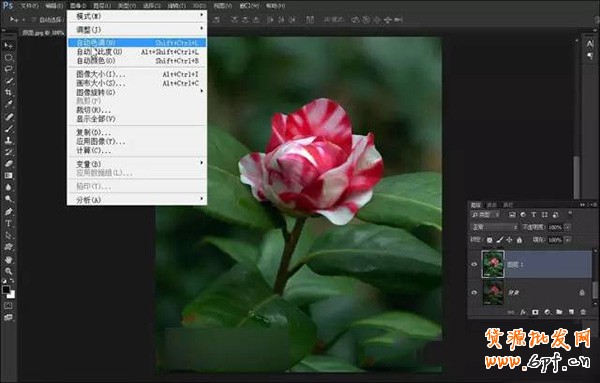 1、首先我們打開原圖,使用ctrl+j復制背景圖層,跟著點擊 “圖像--自動色調”命令,另外,自動顏色,色階里面的自動命令都可以獲得類似的效果。