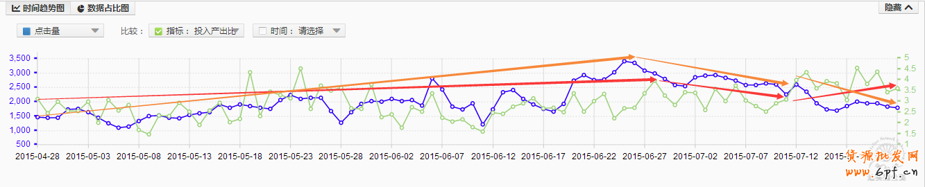 上圖是賬戶點擊量和roi的趨勢對比圖;在4月底到6月底這段期間,寶貝的轉化趨勢較好,所以對賬戶的調整策略是提流,而之后,roi有下滑的趨勢,所以及時地控制了賬戶轉化差的流量,在7月中旬的時候,roi又進一步得到提升。