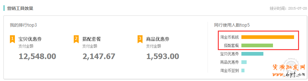 查看店鋪營銷效果,店鋪的寶貝優惠券是最好的,搭配套餐和商品優惠券也還不錯;行業是淘金幣抵錢和搭配套餐比較好;那么店鋪還可以通過這些受眾度較好的營銷手段完善店鋪自身的營銷,提高客單價。