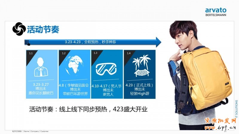 以新秀麗的案例為例。新秀麗是一個知名拉桿箱品牌,客單價較高,在天貓的客單價大約在1500元左右,實際購買人群以30~40歲的客群為主。因此服務商在操作這個店鋪的時候希望讓更年輕的用戶接受這個品牌,特別是85后、90后人群,在傳播的時候也需要更強調年輕感和時尚感。因此,利用韓國人氣明星李敏鎬的代言資源,舉辦了線下的品牌發布會和粉絲見面會,打爆品牌傳播。整體活動下來跟天貓置換到了50多個重量級資源位,拿到了不錯的品牌曝光和流量資源。