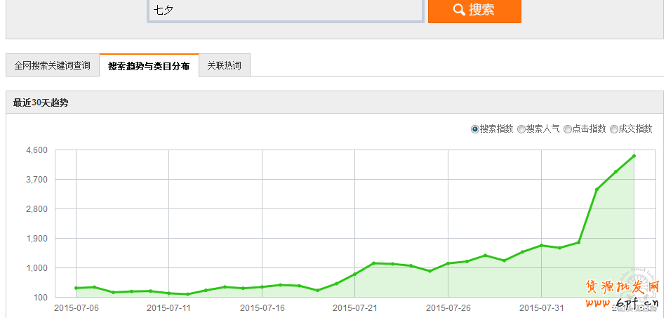 首先我們透過數據魔方來分析七夕相關詞的行業搜索情況和成交情況。