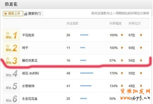 從上圖中可以看出,現在柵欄仿真花這個關鍵詞的上升趨勢很大,一是表明市場上柵欄花的銷量趨勢還不錯,為我們店鋪開發新品提供了一個參考。而且對應的相關產品,也應馬上添加這個飆升的關鍵詞。