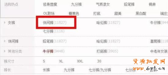 這種選款方式很多賣家都有使用,方法很簡單,這種選款方式選出來的款,一般都已經進入到了寶貝生命周期的成熟階段,會面臨比較大的競爭。在銷量選款時,首先要做的就是選定大詞,比如我做的是休閑褲類目,那么就可以用“休閑褲 女”這個大詞來進行搜索。