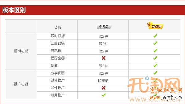 限時打折(不限時長,支持7折以下),團購(精美模版),滿就送,搭配套餐,包郵;自動上下架,自動櫥窗;買家分享自動給優惠;微博推廣,郵件推廣;支持在店內開展試用活動;提高流量,客單價,客戶粘度;美化店鋪等等,功能很強大,而且是免費的。