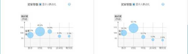柱形是這個詞的消費基數,線型全網的消費基數。基本上都是中層消費等級居多。