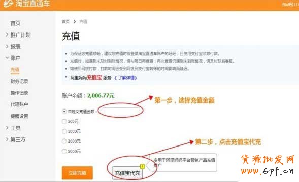 1)通過淘寶/天貓直通車或者鉆石展位充值頁面通過點擊“充值寶代充“進入營銷充值寶服務頁面申請;