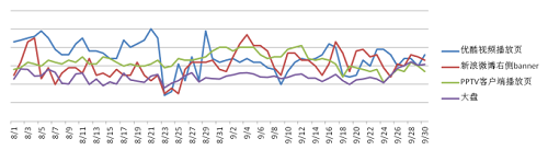 從圖中可看出,以上三個媒體點擊率(CTR)均高于站外大盤均值水平,優酷和新浪微博的流量資源同比也更加明顯。
