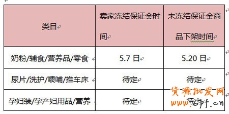 4、尿片/洗護/喂哺/推車床、孕婦裝/孕產婦用品/營養 兩個類目的賣家也請自行凍結保證金,具體執行時間待定。