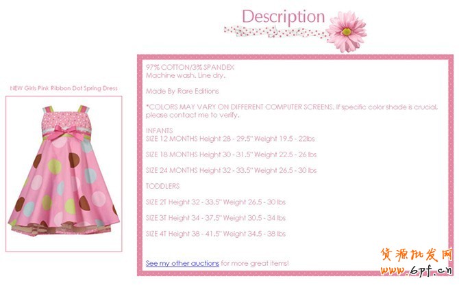 首先,要對物品進行簡單的描述,款式方面,特殊的設計方面,用料顏色等。這段描述可以比較簡短,然后其中可以使用稍多的形容詞,口氣稍微夸張一點,說明物品的獨特性和相當值得購買。服飾類物品的描述中尺碼尤其重要,因為每個國家的尺碼都不同。