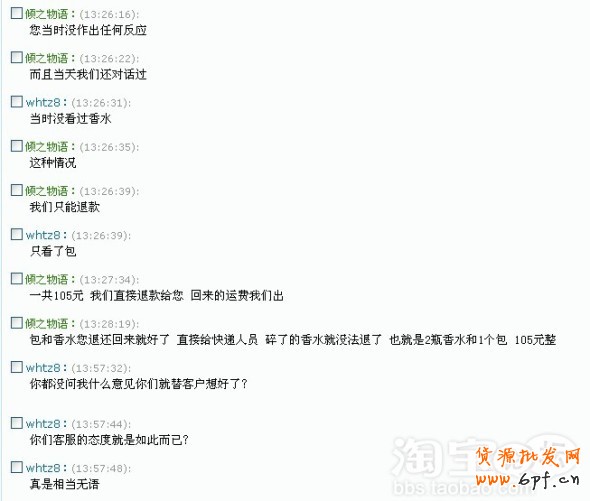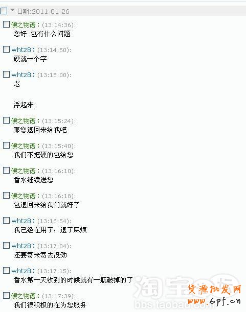 相信大家都清楚,1月17號收到貨,今天1月26號了,期間每天此旺旺最少在線10小時,淘寶可以查詢,沒有和我溝通過1句,也沒作出任何評價,今天1月26號,明天我就關店回家過年了,直接1個中評。我想請問,如果你是買家,你買到了1個包,你感覺皮質太硬,我送你的香水,碎了1瓶,你是先和我聯系,還是先直接中評。本人態度及其誠懇的對待她,終于。露出了本性,我不要她上傳任何圖片,我直接說我全額退款給您,來回運費我也出,我不用您聯系快遞,我幫您聯系順風,快遞會上門取件,香水碎了是禮品,就不用您退了,您把包退我就可以了。請問,作為賣家,我主動全額退款,主動還承擔運費,還主動幫你聯系快遞,還要我們怎么做。難道要我們幫你舔鞋子嗎?那人看我這么堅決的退款,估計又想要這個包,覺得95元買很值得,就找借口,要我再送1瓶香水就算了,就幫我改評價。試問你們每個人,包真的有問題,賣家全額退款你們不是更好嗎?為什么要1個質量不好的包。所以,我已經上傳到了淘寶,希望給這些人嚴厲的處理,過年了,什么壞心的人都有。