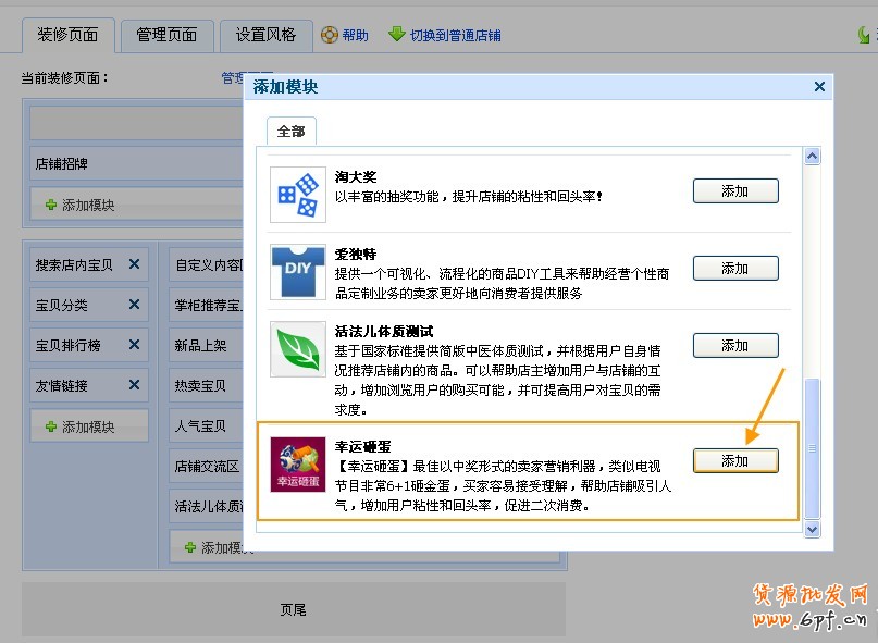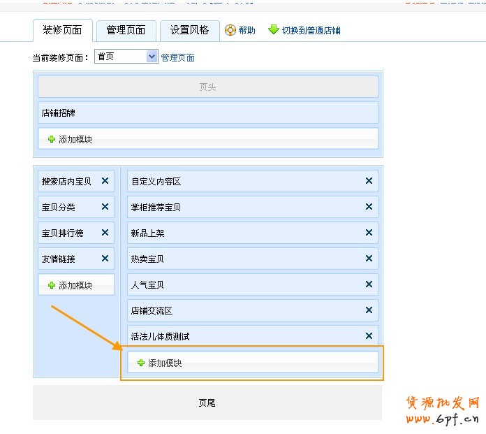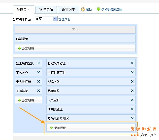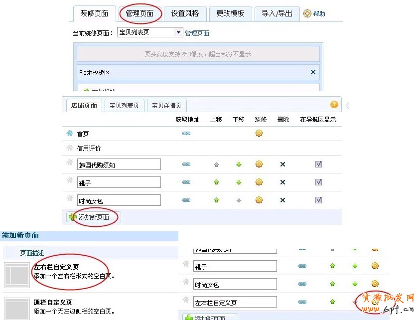 點擊“管理頁面”,然后在“店鋪頁面”那里點擊“添加新頁面”,再點擊“左右欄自定義頁”后面的“添加”,然后點擊那個“圈圈”