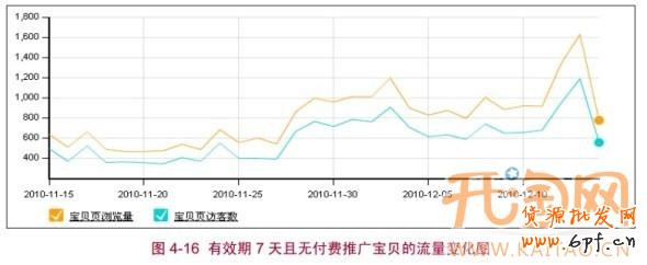如圖4-16所示,一個寶貝在沒有推廣和銷量巨大變化的前提下,基本上每7天會出現一個比較大的流量高峰,如圖中2010年11月17日和2010年11月24日,2010年11月25日以后由于進行了寶貝的有效時間更改。有效時間重新開始計算,出現了一個比較長的平穩期。有時候大家會看到銷量是0的商品反而排在了很前面,就是因為這個商品馬上要下架了(或者說有效時間快到了)。