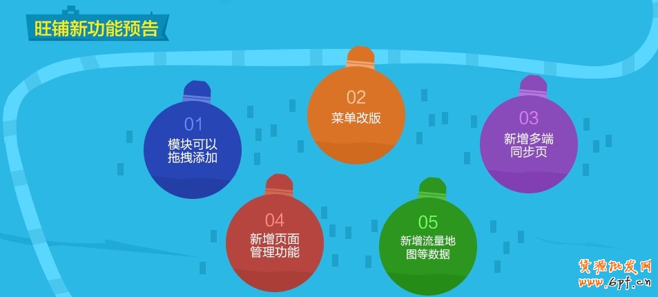旺鋪本期的新功能主要有: 1、模塊拖拽,智能識別可添加的區域 2、模塊移動,按住模塊可自由上下滾屏移動 3、頁面管理,可方便地對所有頁面進行增、刪、設置 4、多端同步頁。