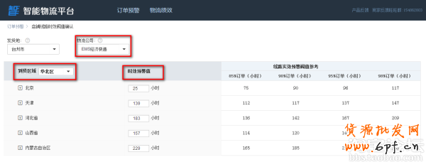 線路時效設置:可以選擇物流公司。到貨區域及時效預警值商家可以自行設置。