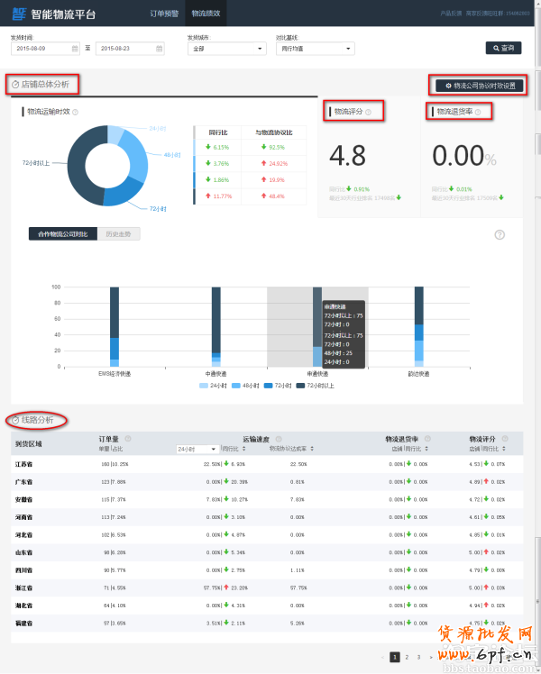 線路分析:主要查看自已店鋪商品物流相關的:物流訂單量、運輸時長分布、物流相關因素所引起的退貨均值及物流評分。