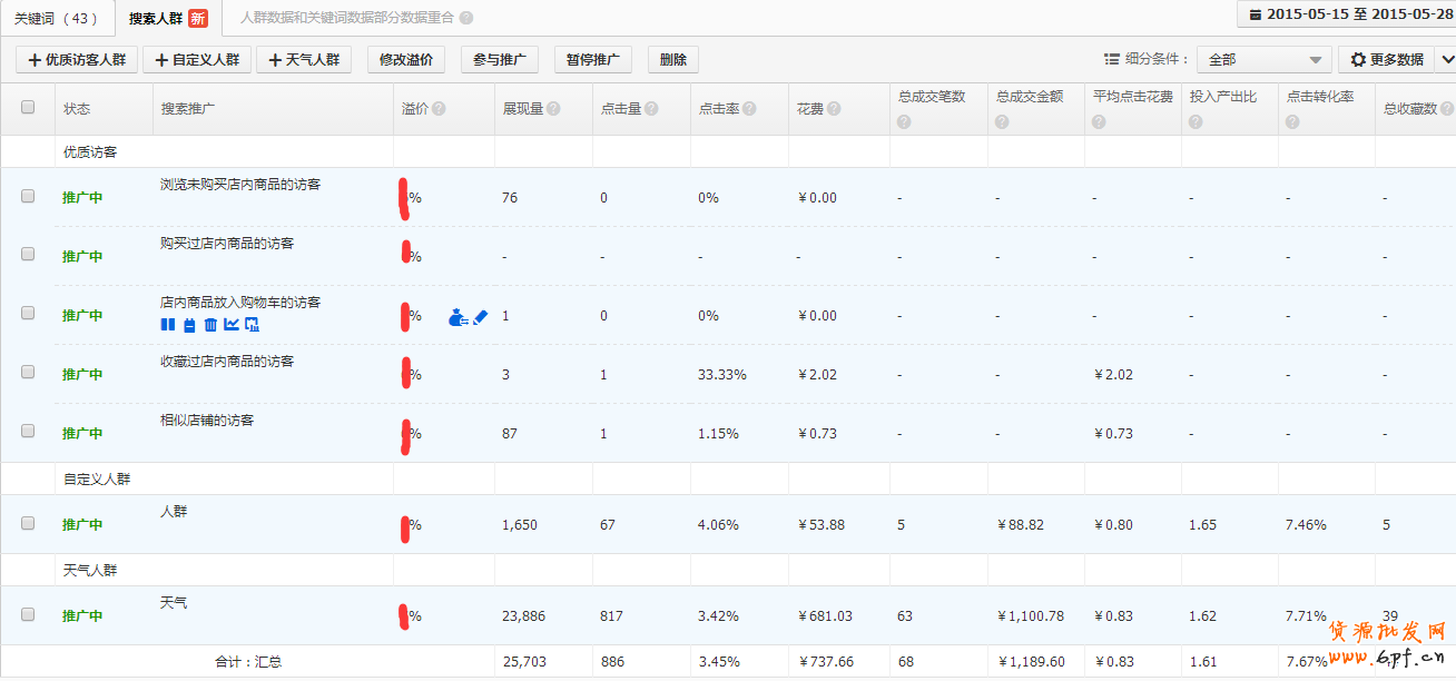 根據(jù)最后的覆蓋人群可以看出,這一部分的客戶人數(shù)是比較少的,相對來說是比較精準的。因為寶貝開始的關(guān)鍵詞質(zhì)量得分就比較高,轉(zhuǎn)化也不錯,所以在設(shè)置出 價時,開始我出的10%,這是一個保守的出價,避免提前下線,如果日限額足夠的話,可以出高一些,再用下坡法,這樣的推廣效果會更快的體現(xiàn)出來。   剛開始接手店鋪的時候,因為店內(nèi)的成交量就比較少,基礎(chǔ)銷量一般,而且枕巾的單價是9.9元一條,所以前期的ROI是很低的,正是為了快速的去改善當 時的轉(zhuǎn)化問題,所以我開通了搜索人群中的自定義人群和天氣人群,當時天氣人群獲取的人群數(shù)量為4萬多,在天氣人群推廣的第一天,就直接提前燒下線了,但是 當時的點擊率沒有提高,不過ppc下降到了1.2左右。