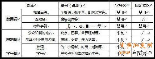 禁用詞指不能出現的詞;限制詞指可以出現和包含,但不能單獨出現的詞;字號區不能全部由限制詞構成;