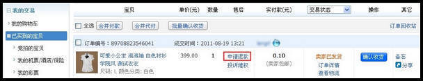 第一步:進入“已買到的寶貝”,找到這筆交易,點擊頁面上的“申請退款”;