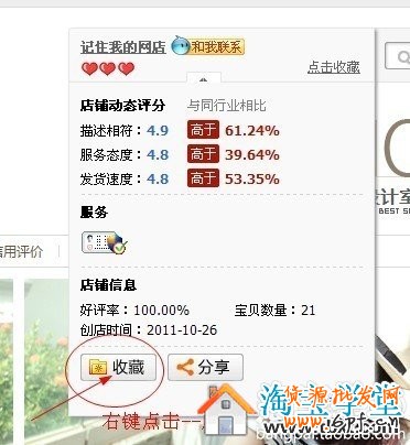 1、在登錄狀態,打開自己家店鋪首頁,點小角小圖標,再出現浮動界面,用右鍵點擊“收藏本店”按鈕,點屬性