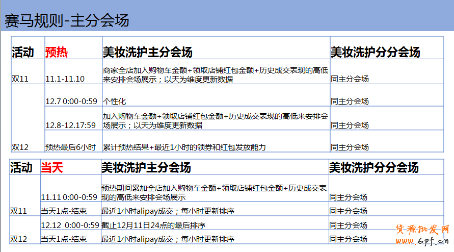雙12比雙11略微不同:1、7號(hào)開始預(yù)熱,預(yù)熱的時(shí)候第一小時(shí)是個(gè)性化展示的,也就是說每個(gè)用戶看到的頁(yè)面是不太一樣的。2、提前進(jìn)入活動(dòng)當(dāng)天的卡位戰(zhàn)爭(zhēng),也就是把雙十二當(dāng)天第一個(gè)小時(shí)在頁(yè)面上的坑位展現(xiàn)排序賽馬時(shí)間提前了。在預(yù)熱最后一天的最后六小時(shí)就開始累積賽馬,且每小時(shí)更新數(shù)據(jù)。