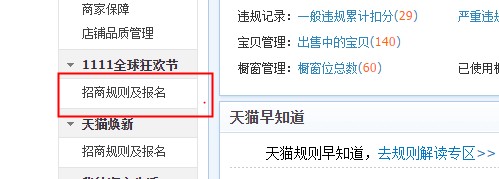 2、進入商家中心左側導航欄,1111全球狂歡節-招商規則及報名。