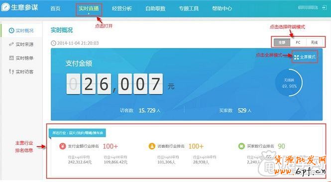 生意參謀實時直播可以分PC與無線端查看實時概況、實時來源、實時榜單、實時訪客,而且還提供了超酷炫的實時直播大屏。