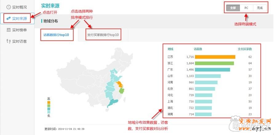 實時來源主要提供店鋪實時訪客地域分布、實時流量來源分布,分訪客數(shù)和下單買家數(shù)讓你了解到店鋪實時訪客top10地域分布,分PC端無線端讓你了解到店鋪細分實時來源效果,實時了解當(dāng)前店鋪流量來源現(xiàn)狀,及時調(diào)整引流策略。