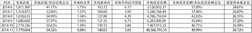 以下數據是森馬官方旗艦店從2014年6月至2014年11月的無線UV占比和銷售額占比情況(含成交回頭客占比):