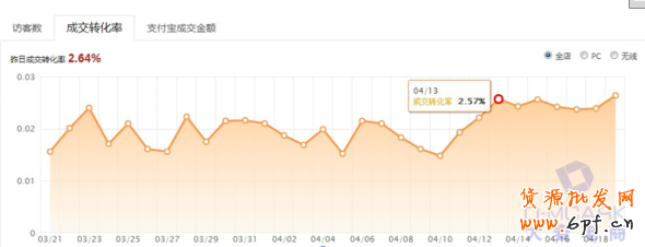全店的流量不斷的往上升,一直處于這個上升的趨勢,在主推款沒有出現問題的情況下, 這種趨勢是很好的。但是在看到這個趨勢的同時,還需要觀察另外的一個維度,那就是全店的轉化率。如下圖: