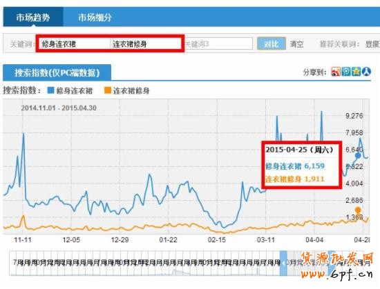 通過上圖數據顯示和關鍵詞設置成有空格,即使順序顛倒了,但是搜索量還是一樣的。但如果關鍵詞當中是沒有空格的,在搜索“修身連衣裙”和“連衣裙修身”時,關鍵詞的順序顛倒,搜索量卻差了很多倍。