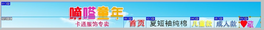 7.現在就可以按照自己的思路去設計導航欄了,內容自選!如果不需要首頁的按鈕就不加進去,如果喜歡QQ圖標也可以自己加進去。也可以根據自己店鋪所銷售的產品添加,不同的季節也可以換不同的導航按鈕進去(我加了首頁、夏短袖純棉款、反季清倉、兒童款、成人款、收藏)。填充同色系的顏色。
