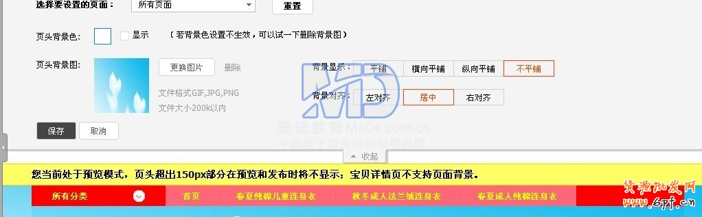 3、在頁頭設置上傳圖2,就是我們在PS中處理存儲尺寸為1500*150的圖片2。選擇不平鋪,居中。
