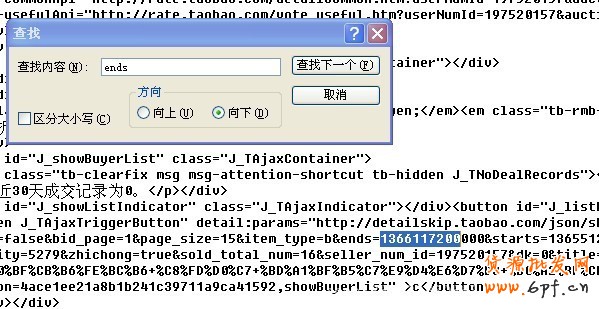找到你同行的寶貝詳情頁,然后找到空白處,點擊鼠標右鍵,會出現一排菜單,選擇查看源代碼,或查看源文件,進入頁面之后,按CTRL+L+F,會出現一個選框如圖,在查找內容里面輸入ends,會出現如下圖選中的數字,選取前十位數字,一定是十位,不能多也不能少。