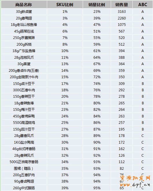 將累計配貨次數為50%的前若干品種定為A類;將配貨次數為20%左右的若干品種定為B類;將其余的品種定為C類。如: