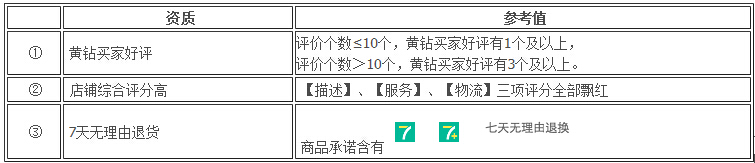 1、一般商品需要滿足以上3個(gè)資質(zhì)要求,且“寶貝與描述評(píng)分”不低于4.7分;