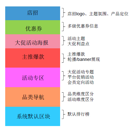 流量越大,首頁設計就越要進行流量分配,盡量多使用活動專題,品類分類,上新的和二級頁面等,否則就要以聚合為主。KA商家可以自定義設計首頁元素,中小商家建議用第三方模版即可,元素已經規范好,選適合自己流量分配的模版。