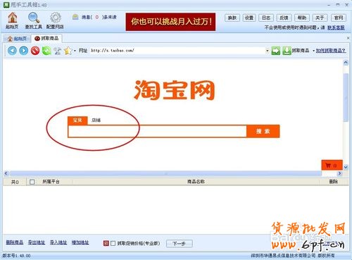 2、如圖所示,這個界面就是淘寶的搜索寶貝/店鋪的界面,在這里找到相關寶貝,進入寶貝詳情頁后抓取該網址商品,依次選擇好待抓取的寶貝,進行下載