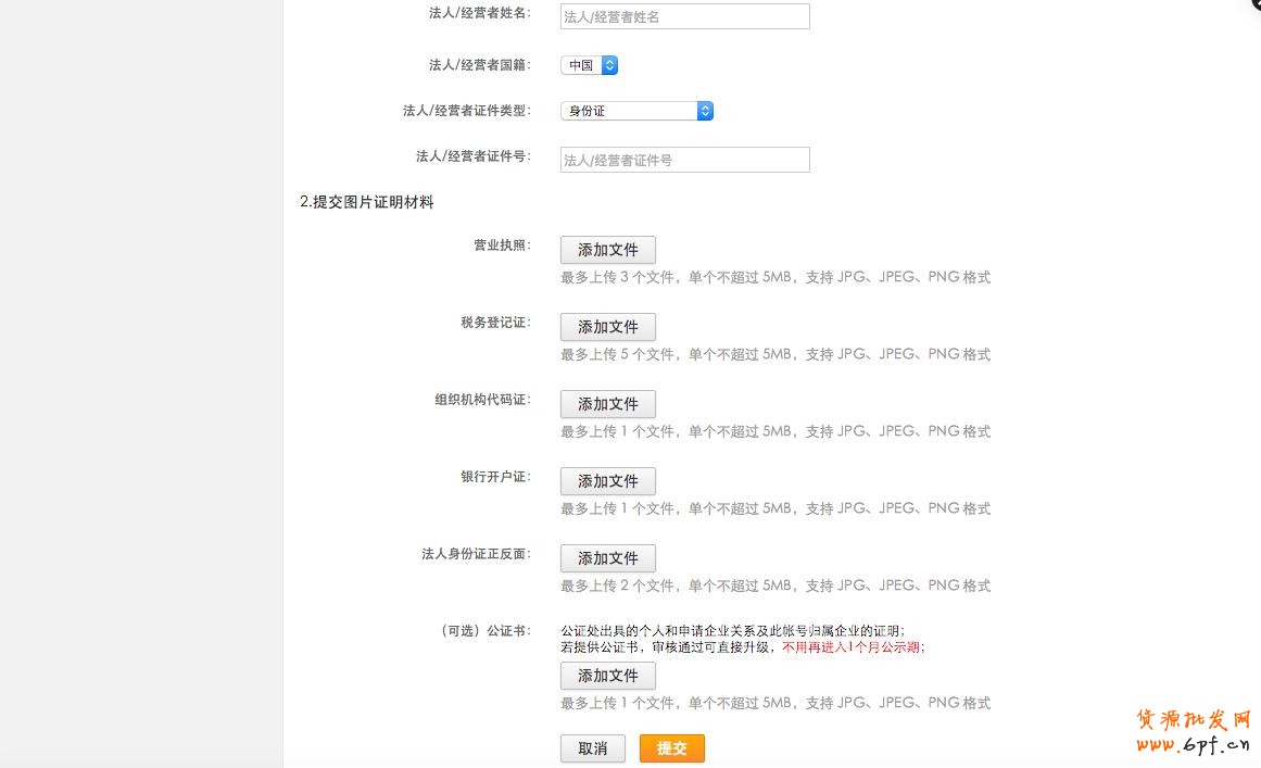上傳“營業(yè)執(zhí)照”、“企業(yè)稅務(wù)登記證”、“銀行開戶證”、“法人身份證正反面”、“公證書”等照片或資料,支持jpeg、jpg、pdf格式,各文件不超過2M,要求資料清晰無水印或處理;