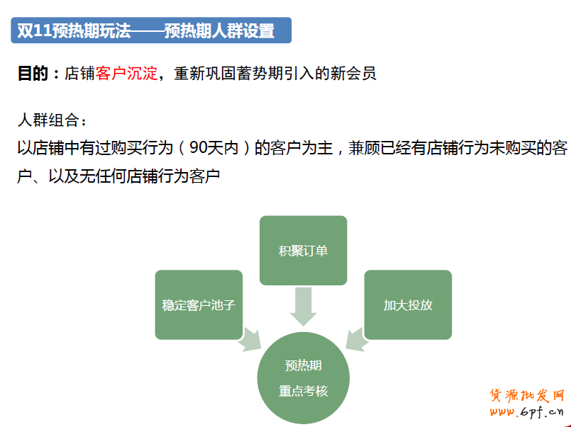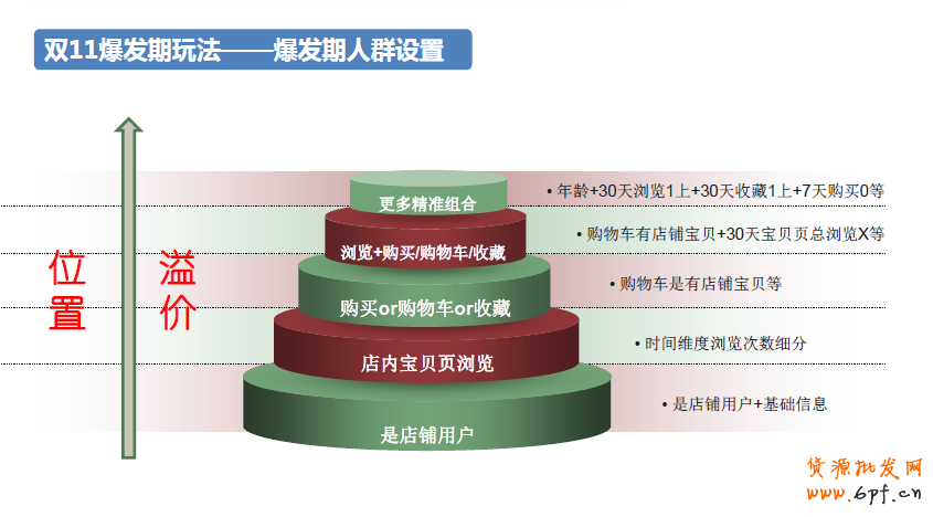 接著來看看整個蓄水期中預算方面的布局。隨著時間越來越接近雙11,預算也應該相應的遞增。針對不同人群,預算也應該有相應的分配,圖中是根據以往的安排和測試的數據得出大致的安排,供大家參考。